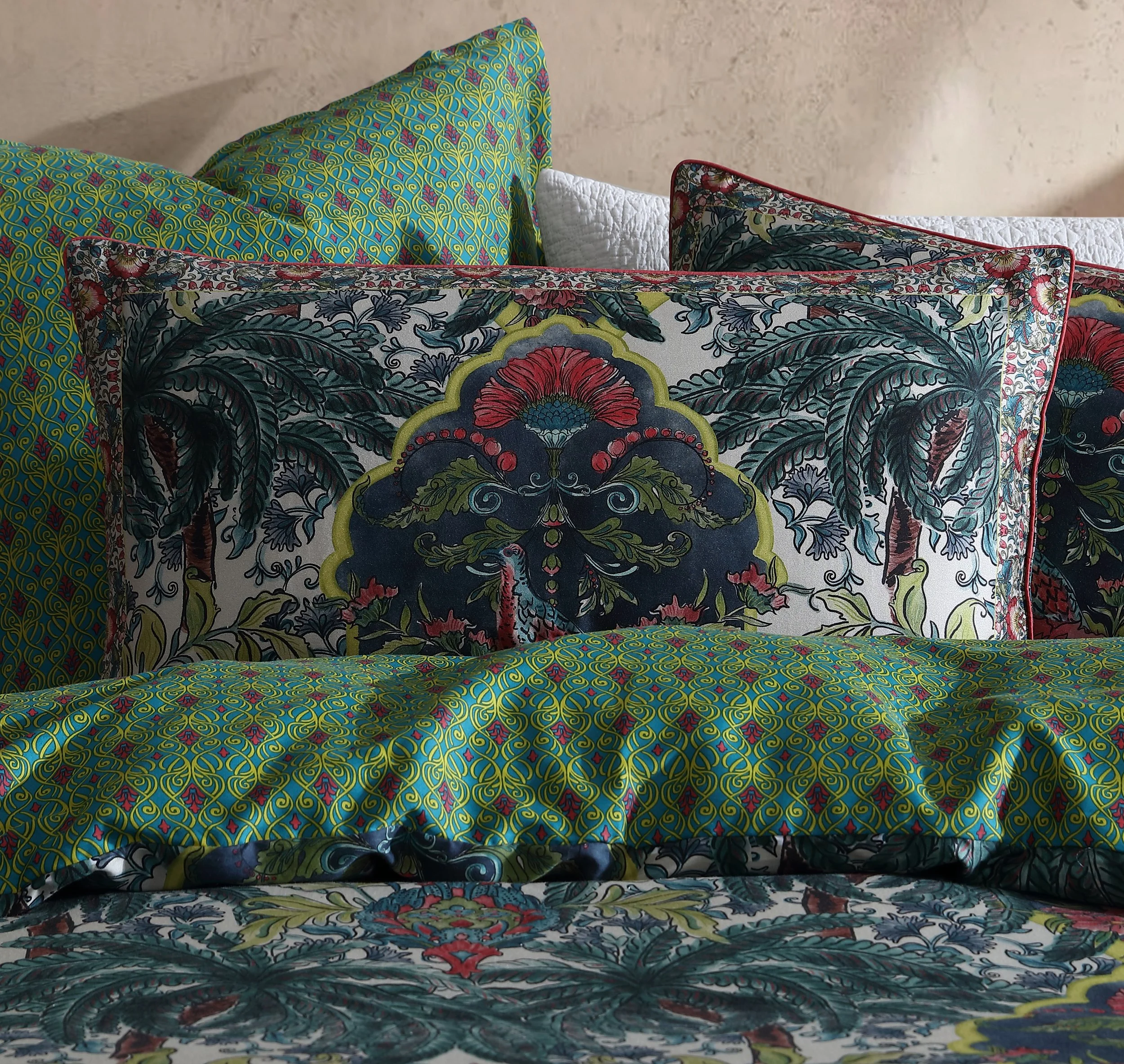 Breewood is a vibrant and lush design that brings a tropical paradise into your bedroom. The quilt cover set features an intricate collage of exotic palm trees, blooming flowers, and ornate motifs that create a rich tapestry of colours, including deep greens, pinks, blues, and highlights of citrus. The reverse side contrasts beautifully with an art nouveau inspired pattern in green, providing versatility and a calming backdrop. The design is both bold and inviting, perfect for those who want to make a statement with their bedding while adding a touch of nature-inspired beauty to their space.