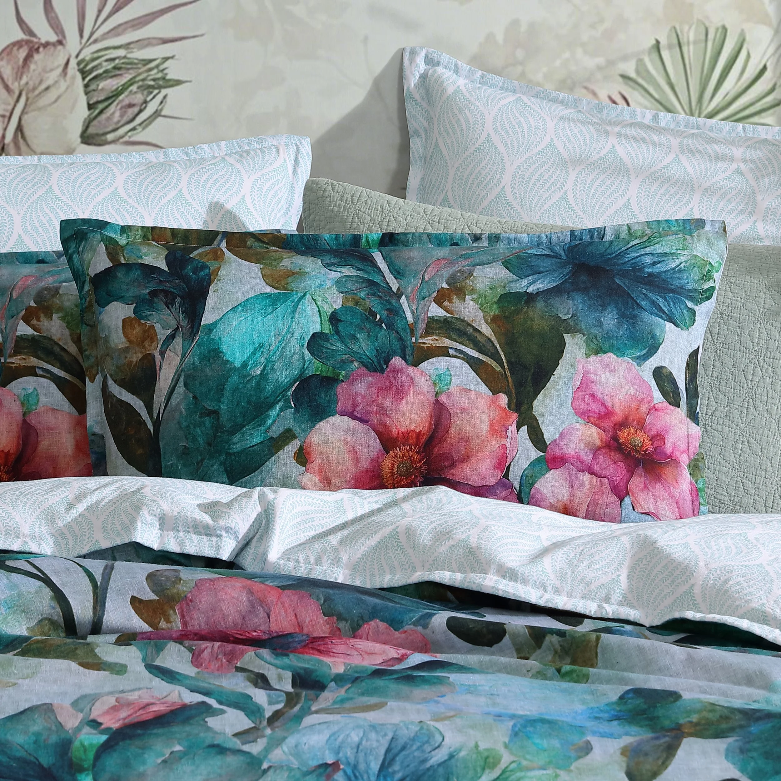 Soft, romantic, and effortlessly charming—the Valentine Quilt Cover Set is a dreamy addition to any bedroom. Featuring large, whimsical watercolour florals in delicate shades of teal and pink, this design brings an artistic touch to your space. A subtle linen-texture overlay adds depth and warmth, enhancing its painterly appeal. For a fresh contrast, the reverse side showcases a leafy spring-inspired geometric print in tonal greens, offering a versatile and tranquil alternative. Perfect for those who love a blend of elegance and nature, the Valentine Quilt Cover Set transforms your bed into a serene floral haven.