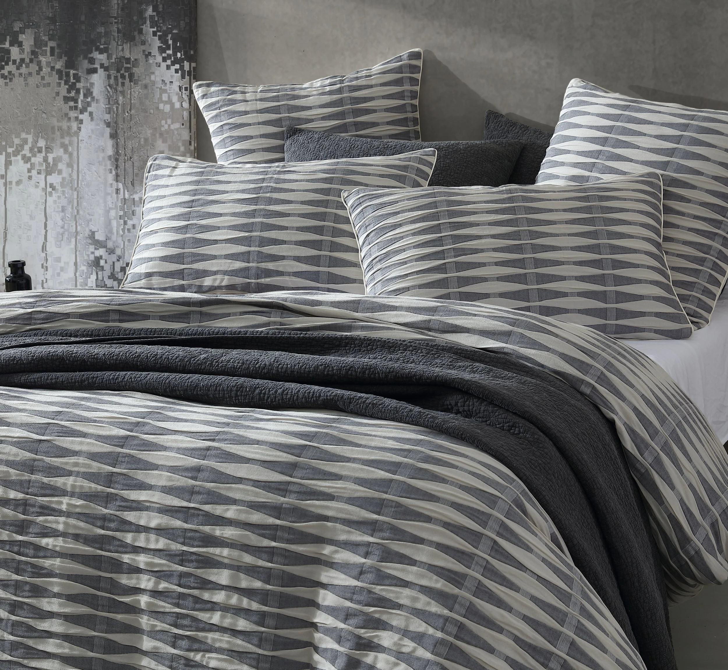 Kirby is a quilt cover set that commands attention with its oversized shapes and bold colour contrasts. Featuring large honeycomb patterns in warm stone and stark charcoal, it creates a striking graphic effect. The interplay of horizontal and vertical stripes is further emphasized by the arrangement of pillows and accessories, adding depth to the quilt cover. A modern corded piped edge completes the look with a contemporary touch, making Kirby a standout addition to your bedroom